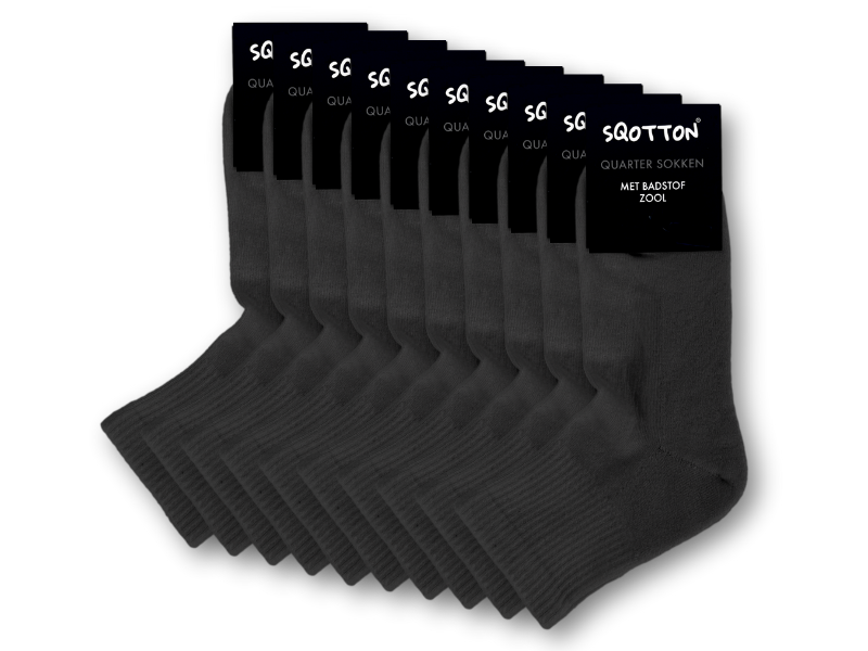 Set van 10 paar extra comfortabele badstof quarter sneakersokken in de kleur zwart. Deze halfhoge uniseks sokken zijn gemaakt van een zachte, ademende katoenmix en hebben een badstofvoering aan de onderzijde, van hiel tot teen. Hierdoor voelen ze niet alleen zachter aan, maar bieden ze ook meer warmte, vochtabsorptie en lichte schokdemping. Ideaal voor dagelijks gebruik, tijdens het werken én voor momenten waarop je extra demping wilt, zoals bij wandelen, sporten of andere actieve bezigheden.