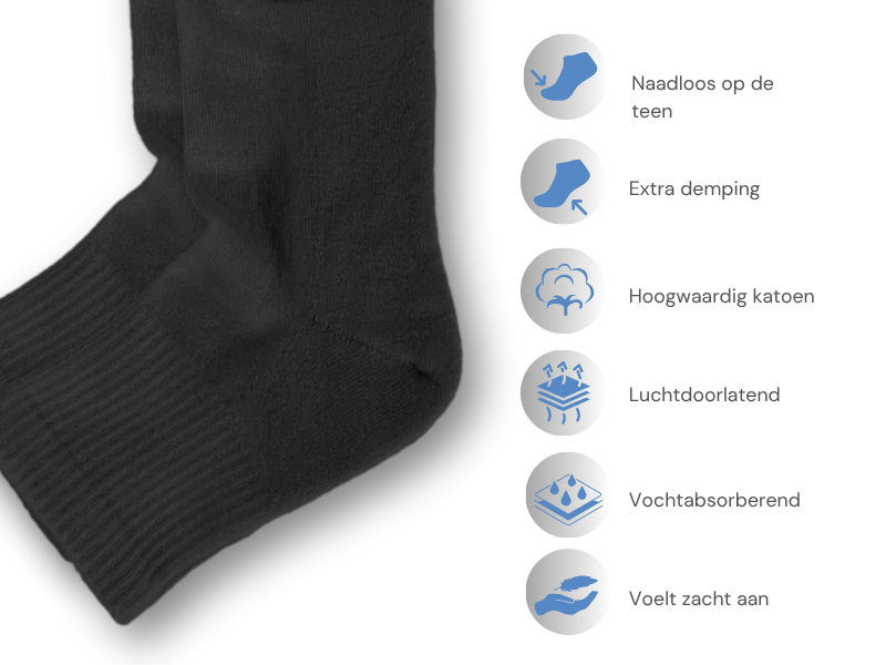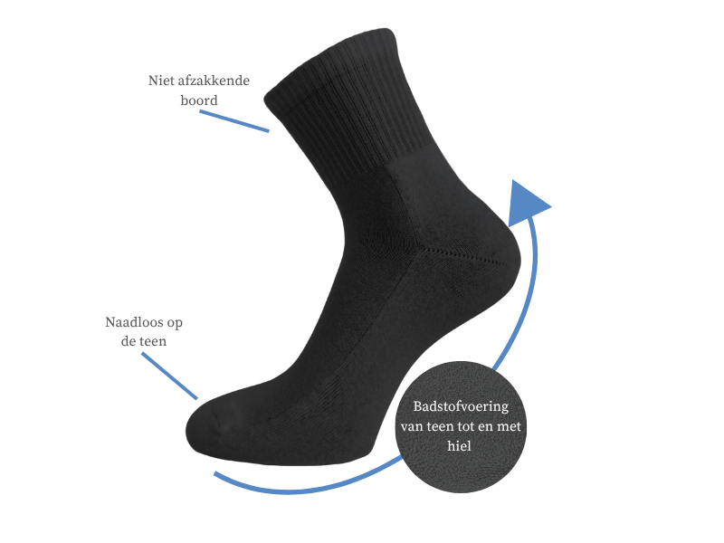 Badstofvoering: De onderkant van de sokken, is voorzien van een badstofvoering voor vochtabsorptie en lichte schokdemping.