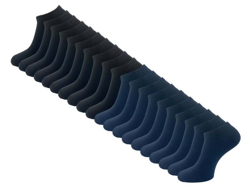 Set van 20 paar basic sneakersokken van het merk VANSENZO in de kleur zwart en marine. Deze fijne dunne sneakersokken zijn geschikt voor zowel dames als voor heren. De sokken zijn gemaakt van een katoenmix die zacht en comfortabel aanvoelt, een ideale basic om te dragen in de zomer. De sneakersokken zijn ademend, anti-transpirerend en hebben een stevige teennaad. Deze basic sneakersokken zijn verkrijgbaar in maat 39-42 en 43-46. Deze sneakersokken worden geleverd in een voordeelpak van 20 paar.