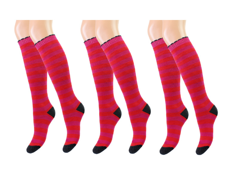 OndermodeNachtmodeSportmodeAccessoiresBeschrijving3 paar Dames kniekousen badstof gestreept fuchsia-rood